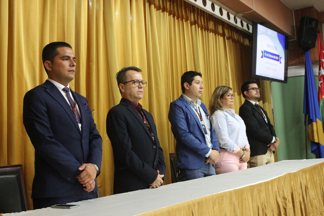 Imagen: Mesa principal, de izquierda a derecha, Secretario General, Abogado Wilson Rey Pedroza, Vicerrector Administrativo CP Juan Carlos Yepes Patiño, Vicerrector Académico Mag. Néstor Guillermo Rodríguez, Directora de Relaciones Internacionales e Interinstitucionales, Mag Ing. Martha Cecilia Guarnizo García, Director de Investigaciones, Mag. Johan Hernán Pérez.
