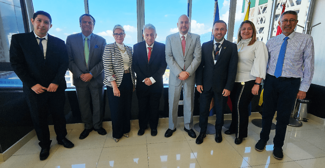 De izquierda a Derecha: Nestor Rodríguez Suárez vicerrector académico - UDI, Juan Pablo Pardo coordinador de protocolo UAmérica, María Fernanda Vega directora de internacionalización- UAmérica, Jairo Castro Castro presidente institucional -UDI, Mario Posada García Peña rector - UAmérica, Jairo Augusto Castro Castro rector – UDI, Alejandra Mejía Guzmán vicerrectora académica y de investigaciones - UAmérica, Miguel Manrique Córdoba director de sistema de evaluación universitario - UAmérica.