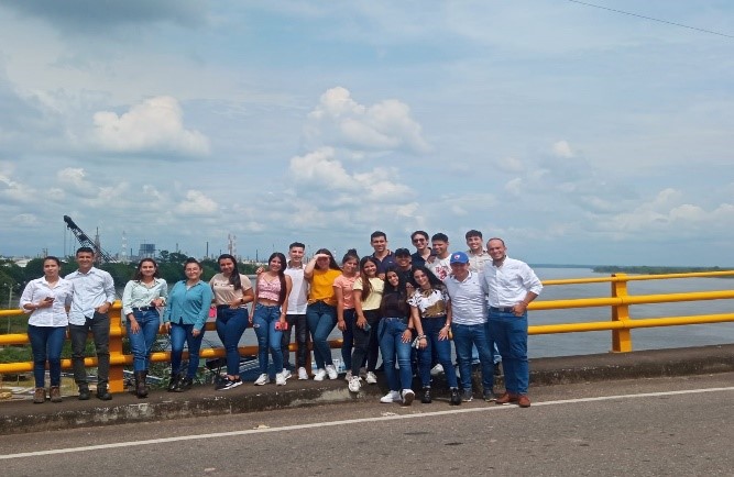 Imágenes: Grupo de estudiantes de Ingeniería Industrial del campus San Gil participantes de la visita, arriba en el muelle de Barrancabermeja, abajo en el puente de Yondó