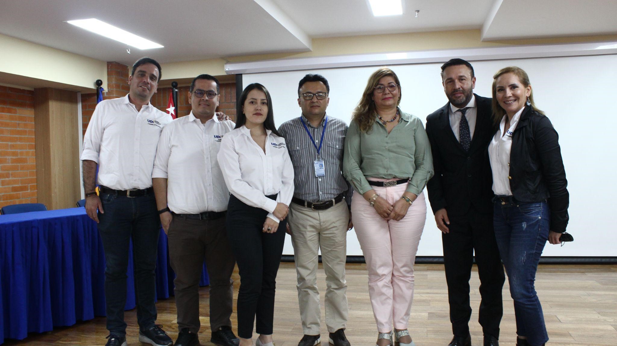 Imagen: De derecha a izquierda, Mario Andrés Pizarro Camargo - Director del programa de Comunicación Social, Miguel Camargo Muñoz - Director del programa de Publicidad y Marketing Digital, Gina Constanza Riascos Chalapud - Directora del programa de Diseño Industrial, Docente investigador Omar Alejandro Afanador Ortiz, Mg. Martha Cecilia Guarnizo García - Directora de Relaciones Internacionales e Interinstitucionales, Mg. Jairo Augusto Castro Castro - Rector, Diana Sofía Niño Rodríguez – Directora de Diseño Gráfico.
